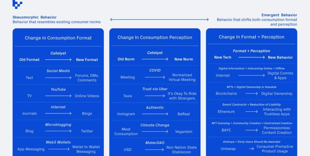 在整個21世紀,新的消費者行為的主要催化劑是新穎的社交技術:互聯網、移動電話、社交網絡和區塊鏈等。其中,區塊鏈既是一種技術創新,也是一場社會革命,web3已經播下了肥沃的土壤,未來這項技術將繼續播下新的消費行為的種子。