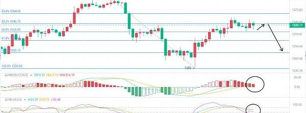 1340-1345附近空單進場,止盈點位1322-1317破位看1308,止損在1365一線