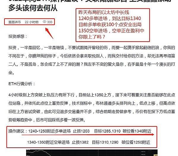 XRP/HKD-2.87%昨天早間給出的ETH思路是完美的,預測是直接1240附近多單進場,而結果與我預測完全一致,把行情掐死在計算當中,行情漲至1340附近,收獲100多點利潤。1345反手空單,目前正在盈利中,恭喜敢跟上董晨一起的客戶,夠貪,有膽,一直相信董晨的朋友讓我們一起走向共贏的局面。?