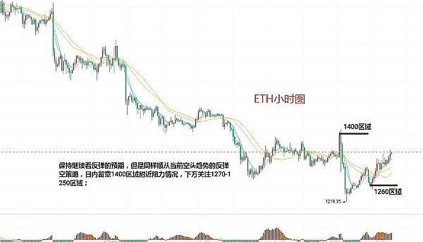 9月23日以太坊(ETH)合約技術面分析:今日就簡單說下,以太相比于大餅雖然走勢幾乎一樣,但是以太漲少跌多,做空還是首選更好;短周期小時圖來看昨日下探1220區域后一路震蕩上行,晚上觸及前區間下沿之后回落,凌晨繼續踩住支撐反彈;短期也是偏強震蕩格局,沒有形成強反彈的趨勢,保持繼續看反彈的預期,但是同樣順從當前空頭趨勢的反彈空策略,所以今日留意1400區域附近阻力情況,下方關注1270-1250區域即可;因此今日ETH短線合約交易策略:反抽1380-1400區域空,止損1420區域,目標看1320-1300區域;下方1270-1250區域多,止損1220區域,目標看1320-1340區域;