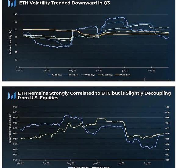 在整個7月和8月,ETH的日均波動幅度要小得多。在經歷了極具挑戰性的第二季度之后,加密貨幣和股票市場的絕對波動性都出現下降。以太坊與比特幣的相關性保持在90%附近,而與標準普爾500指數的相關性略有下降。