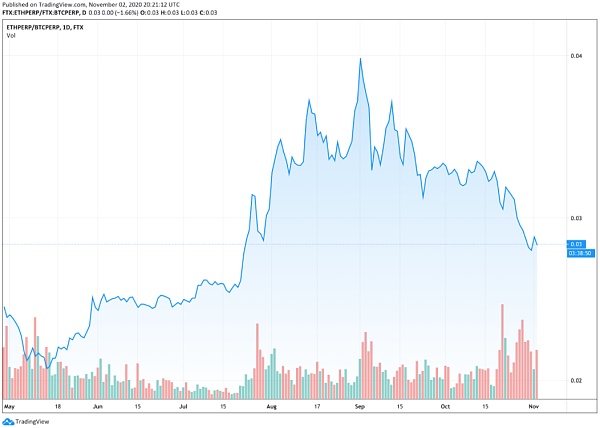 為了了解價差交易在實際中的工作方式,讓我們看一下Deribit上的ETH-PERP / BTC-PERP的示例。