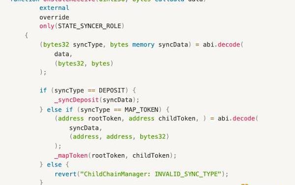 data:包括bytes32類型的syncType、bytes類型的syncData。其中,syncType代表業務類型,包括deposit和mapping代幣映射;當syncType為mapping時,syncData為編碼后的rootToken地址、childToken地址和bytes32類型的tokenType;當syncType為deposit時,syncData為編碼后的user地址、rootToken地址和bytes類型的depositData。depositData在REC20中是數量,ERC721中指的是tokenId。