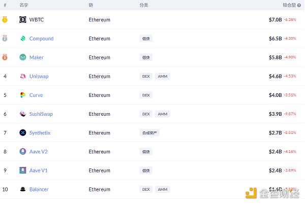 DeFi項目鎖定資產前十排名及鎖倉量,數據來源:Debank
