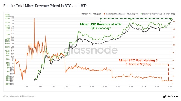 本周,比特幣礦工收入創下了52300美元/天的歷史新高。盡管區塊補貼在2020年5月減半。由于礦工成本(CAPEX和OPEX)一般都是以法幣計價,這對保證比特幣協議的持續安全是有積極意義的。