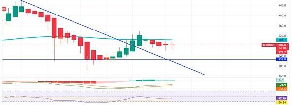 根據4小時圖表,BNB突破50SMMA,并試圖進入下降趨勢。交易量概況指標確定279美元為強勢交易區域。可以重新測試回50SMMA。