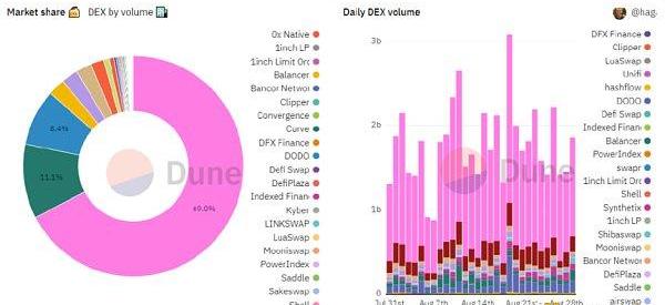 以7日交易量為基準,Uniswap市場份額高達69%,平均24小時交易量穩定在十億美元量級以上,兩項指標均位列賽道第一,且遙遙領先于其它競爭對手,或將進一步加強其網絡效應。