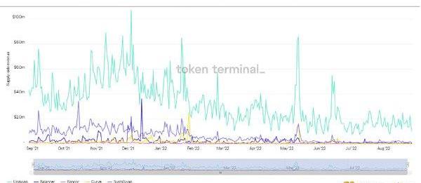 另一方面,更高的資金效率也意味著LP賺取更多交易費用的機會更大。因此,Uniswap不僅對LP更具吸引力,其供給側收入相對于其它DEX也更高。