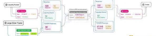 Fraxswap的核心功能,是通過一個嵌入式TWAMM來優化和完成FRAX的「長期訂單」。這里的長期訂單也可以理解為大宗訂單,Fraxswap將其流程囊括為訂單組池和以小時為單位進行的對齊訂單到期。長期訂單在Fraxswap上將永遠先于其他任何交互之前執行,并且每個區塊執行一次。