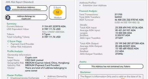 只需要輸入錢包地址,工具即可自動化給出AML風險報告,并對該地址進行打分,使用0-99反映非法加密活動風險。