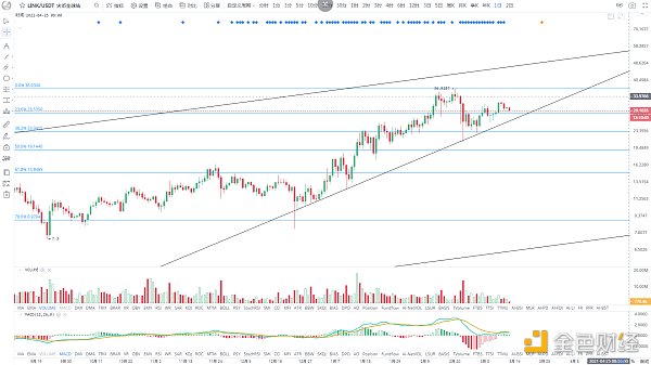 日線延續區間盤整,不破33美金短線暫時持有,強支撐27美金,趨勢依舊向上。