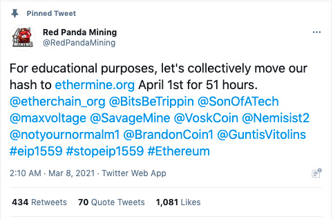 近期,推特網友「Red Panda Mining」發起一項運動,號召反對 EIP-1559 的礦工,將算力切換至反對派礦池,宣誓主權。