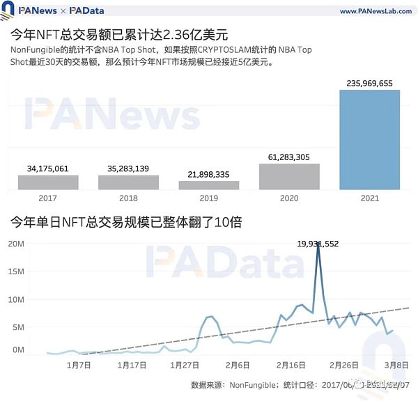 而且,根據PAData的進一步觀察,NonFungible統計的NFT應用中并未涵蓋近期的“網紅”應用NBA Top Shot,而根據CRYPTOSLAM的統計,截至3月9日,NBA Top Shot最近30天的總銷售額已經達到了2.63億美元,與其他應用今年的總銷售額相當。如果算上NBA Top Shot,那么今年NFT市場的總交易規模或已達到約5億美元,相當于過去三年的4倍多。