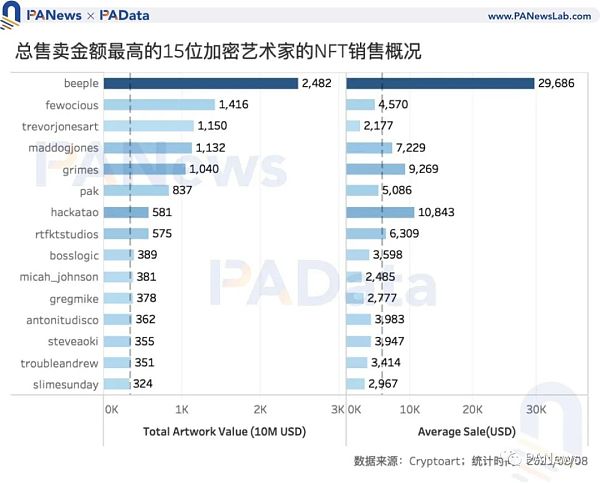 目前,在加密藝術領域中,藝術家Beeple的累計售賣金額最高,達到了2482萬美元,另外,fewocious、trevorjonesart、maddogjones和grimes這四位藝術家的售賣總額也超過了1000萬美元。但從單個加密藝術NFT的售價來看,Beeple無疑是目前最當紅的加密藝術家。他的作品的平均售價已經達到了2.97萬美元,隨著Everydays: The First 5000 Days在佳士得賣出,相信他的作品的平均售價還將大幅上升。另外,hackatao和grimes的作品售價也較高,目前的平均售價已經接近或超過1萬美元。