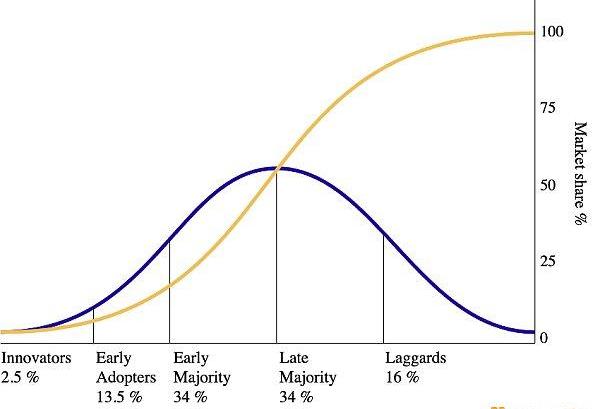 在創新擴散曲線中,可以看到Web3從Innovator向EarlyAdopter的轉換過程,雖然以絕對市場占有率而言,這個數值仍然很小,但是桌面端、企業級、基礎性的設施都在逐步建設中,屬于技術逐步擴散的過程。