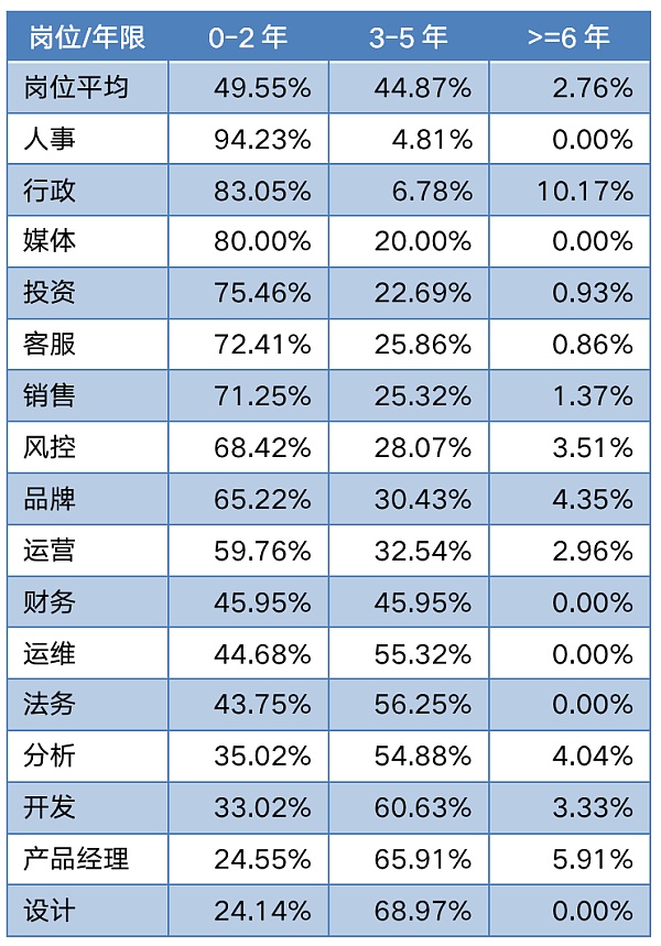 注:數據按照0-2年從業經驗人員占比降序排列