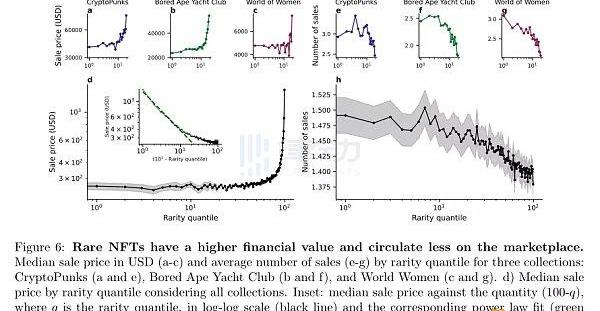 大多數普通/非稀有的NFT在市場上表現得更加統一實際上,在今年4月份倫敦大學的一篇研究論文《稀有度如何塑造NFT市場》中表明,綜合市場上主流的NFT系列,長期來看那些屬性普通的NFT在二級市場上的交易情況相對稀有的NFT更加統一,市場似乎認為它們基本上是「可替代的」。對于那些屬性稀有的NFT,研究也表明它們的交易次數會隨著稀有度增高大幅度下降。