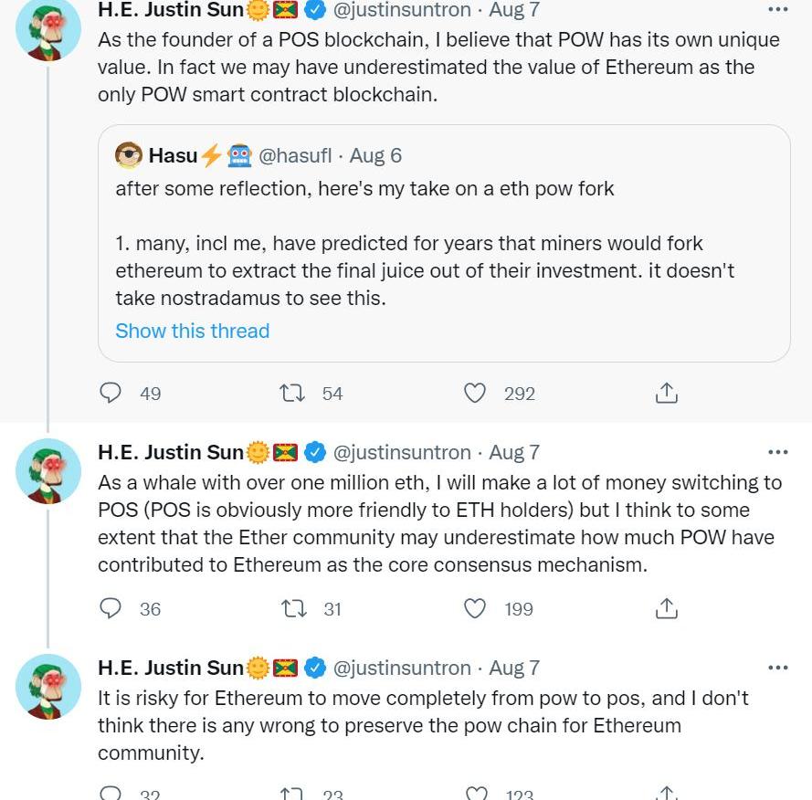 Tron創始人孫宇晨先生在評論以太坊可能出現的分叉時就曾表示,“我相信PoW有其獨特的價值。事實上我們可能都低估了以太坊作為僅有的PoW機制下智能合約的價值。PoW對于過往以太坊生態發展的貢獻有目共睹,未來將繼續支持社區的發展。”