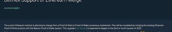 8月9日,Bitfinex發布公告明確表示支持以太坊合并。Bitifnex表示,不打算在此升級期間暫停任何交易活動。此外,ETH/USDt、ETH/BTC和ETH/EURt永續合約的交易將照常進行,并在實施后遵循PoS共識機制。