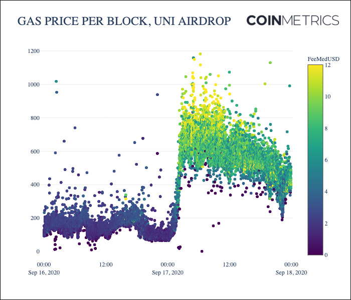 下圖顯示了UNI空投前后每個區塊的Gas費。每個點代表單個區塊的平均Gas price,以GWEI計價。每個點的顏色表示每個區塊的交易費中位數,以美元為單位。隨著Gas費的飆升,交易費中位數暫時達到12美元以上。